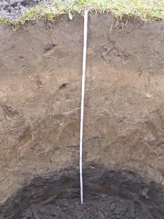 | Tiefe 300cm: Die Kiesschicht ist erreicht. Darin sind viele Holzstücke zu finden. | ||